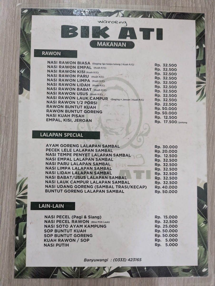 Located in the heart of Banyuwangi, Rawon Bik Ati welcomes you to indulge in its exquisite selection of traditional Indonesian cuisine, primarily centered around the rich and flavorful Rawon. This eatery is celebrated for its authentic broth, boasting deep, dark hues and a perfectly balanced saltiness that leaves patrons craving more.